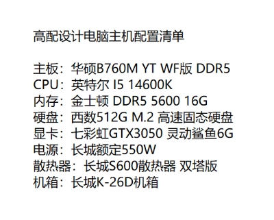 專爲設計師、剪輯師、建模師打造的高配設計主機,硬核配置+穩定輸出,讓創意高效落地。搭載英特爾i5-14600K,14核20線程,最高睿頻5.3GHz,多任務渲染、視頻導出、大型設計軟件並(bìng)行運行流暢不卡頓。搭配華碩B760M YT WF版 DDR5主闆,高速傳輸與穩定供電兼備(bèi),完美釋放平台性能。